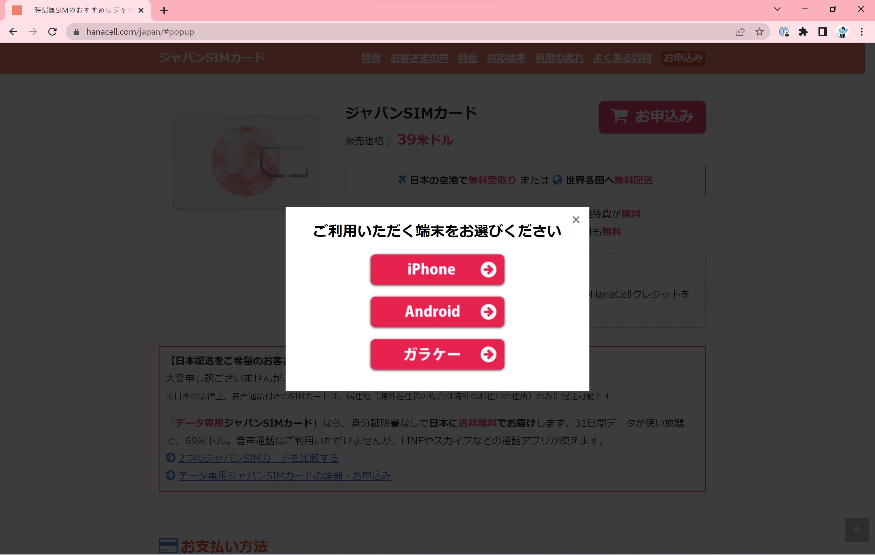 SIM카드는 국제 배송 또는 일본 국내 공항 방문으로 수령할 수 있는데, 한국 여권을 가지고 있는 한국 거주자는 일본 국내 공항 방문으로만 수령이 가능합니다.