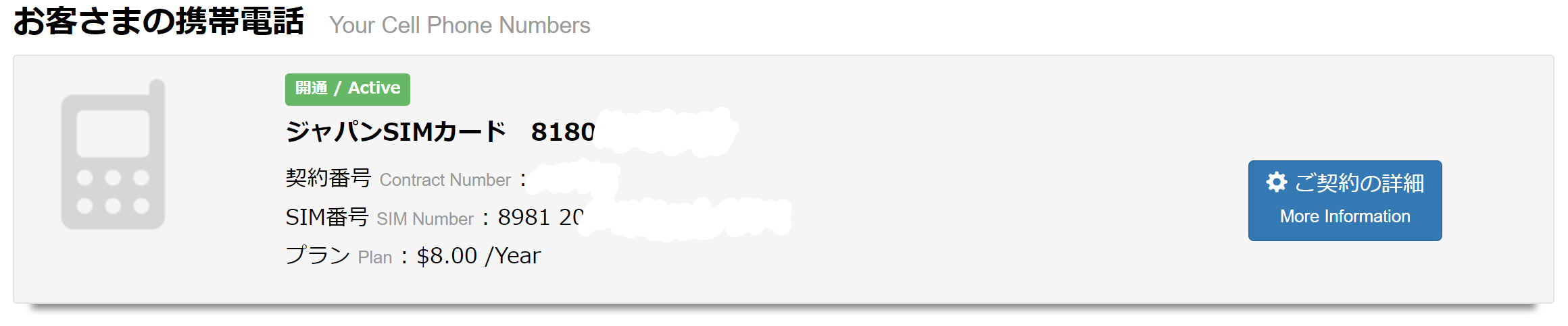 활성화를 진행하신 후 아래 사이트에 로그인해 보았을 때 저와 같이 초록색 「開通 / Active」라고 표시되면 개통이 완료된 것이니 문자 인증 등에 활용하시면 됩니다.