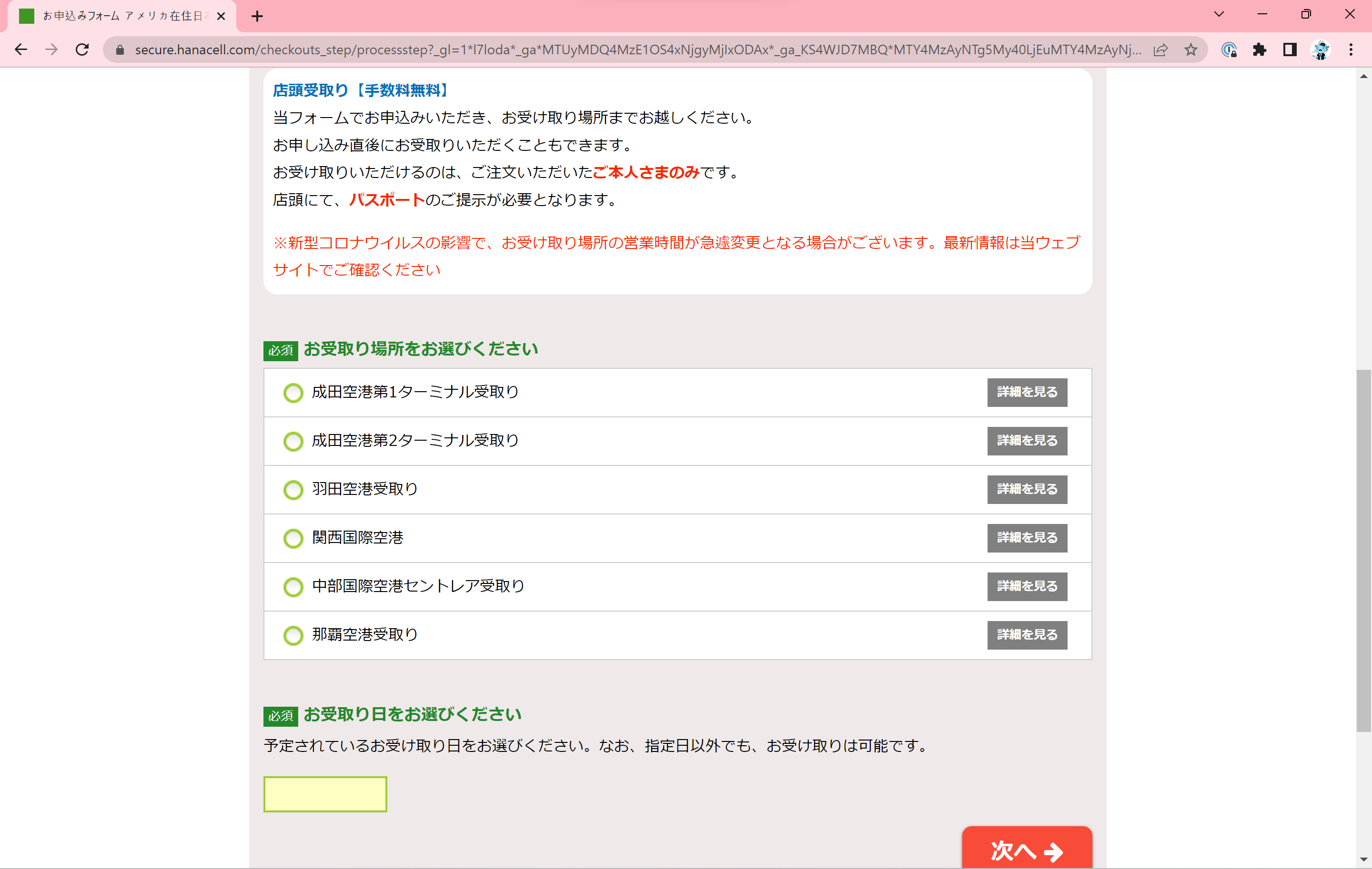 방문하실 공항 및 터미널을 선택하시고, 바로 밑 녹색 상자에 수령일을 넣은 뒤 빨간색 「次へ」 버튼을 눌러주세요.