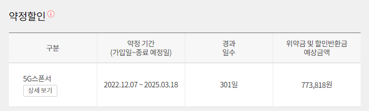 - 7~24개월차: 해지일까지 할인 받은 금액 × (남은 약정일수 ÷ 550)