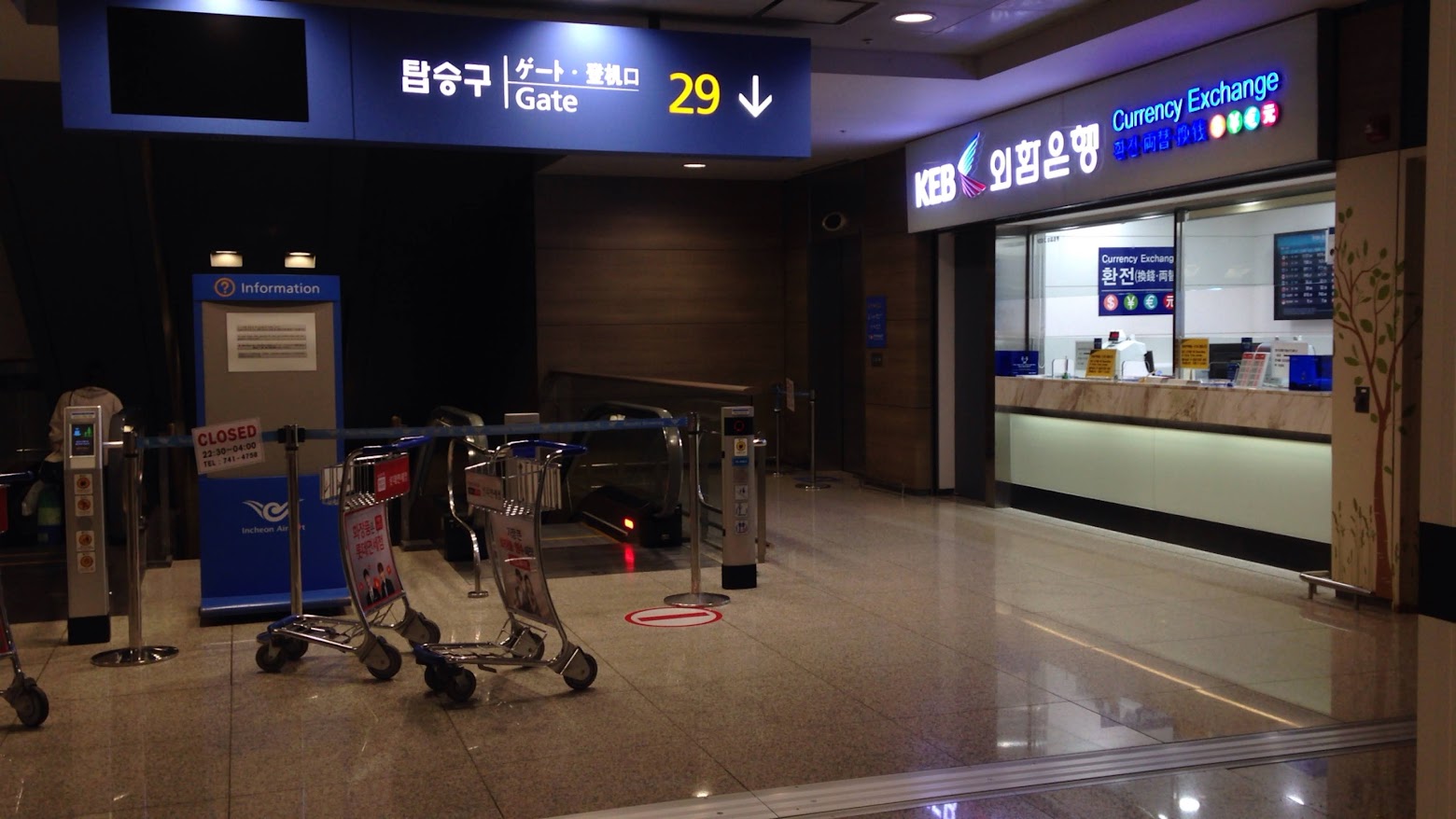 창문과 보딩브릿지는 온데간데없고, 웬 은행 환전소 앞에 내려가는 에스컬레이터가...
