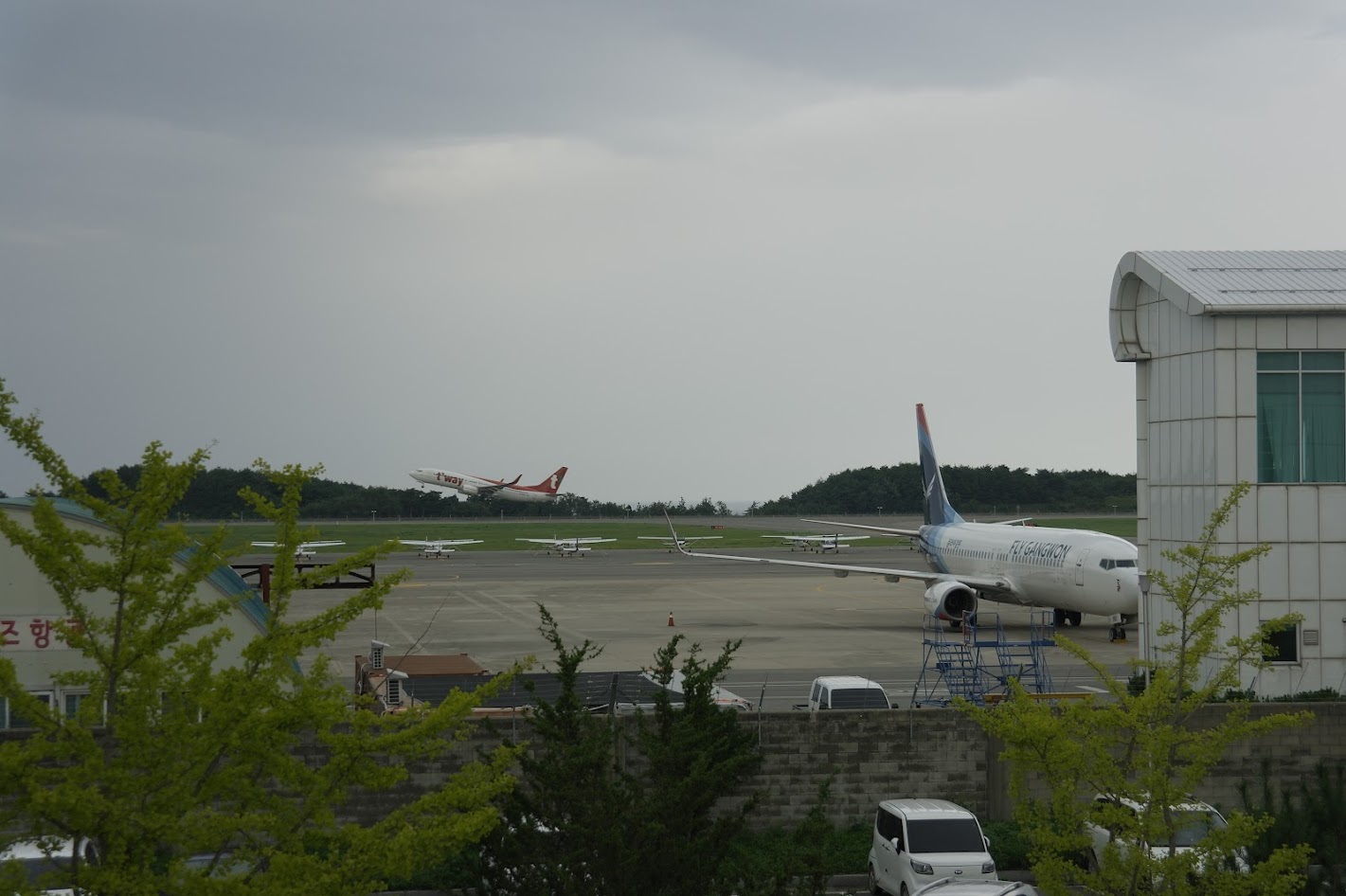 체크인을 하고 잠깐 다시 나와서 플라이강원 항공기를 담고 있는데, 이번에는 아까 그 티웨이항공 비행기가 이륙하는 모습을 담을 수 있었습니다.