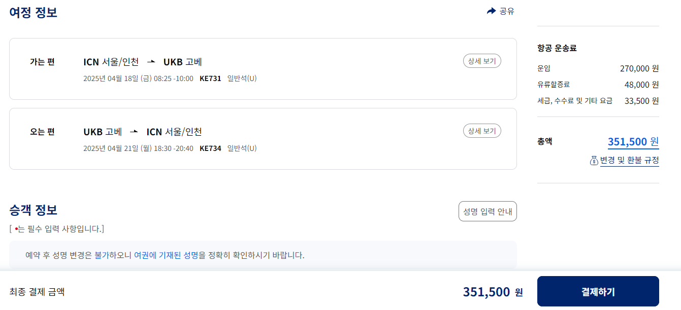 항공편 가격은 왕복의 경우 총액기준 351,500원부터 시작하며, 대한항공 공지에 있는 쿠폰 코드를 사용하면 최저 324,500원에 구매가 가능합니다.