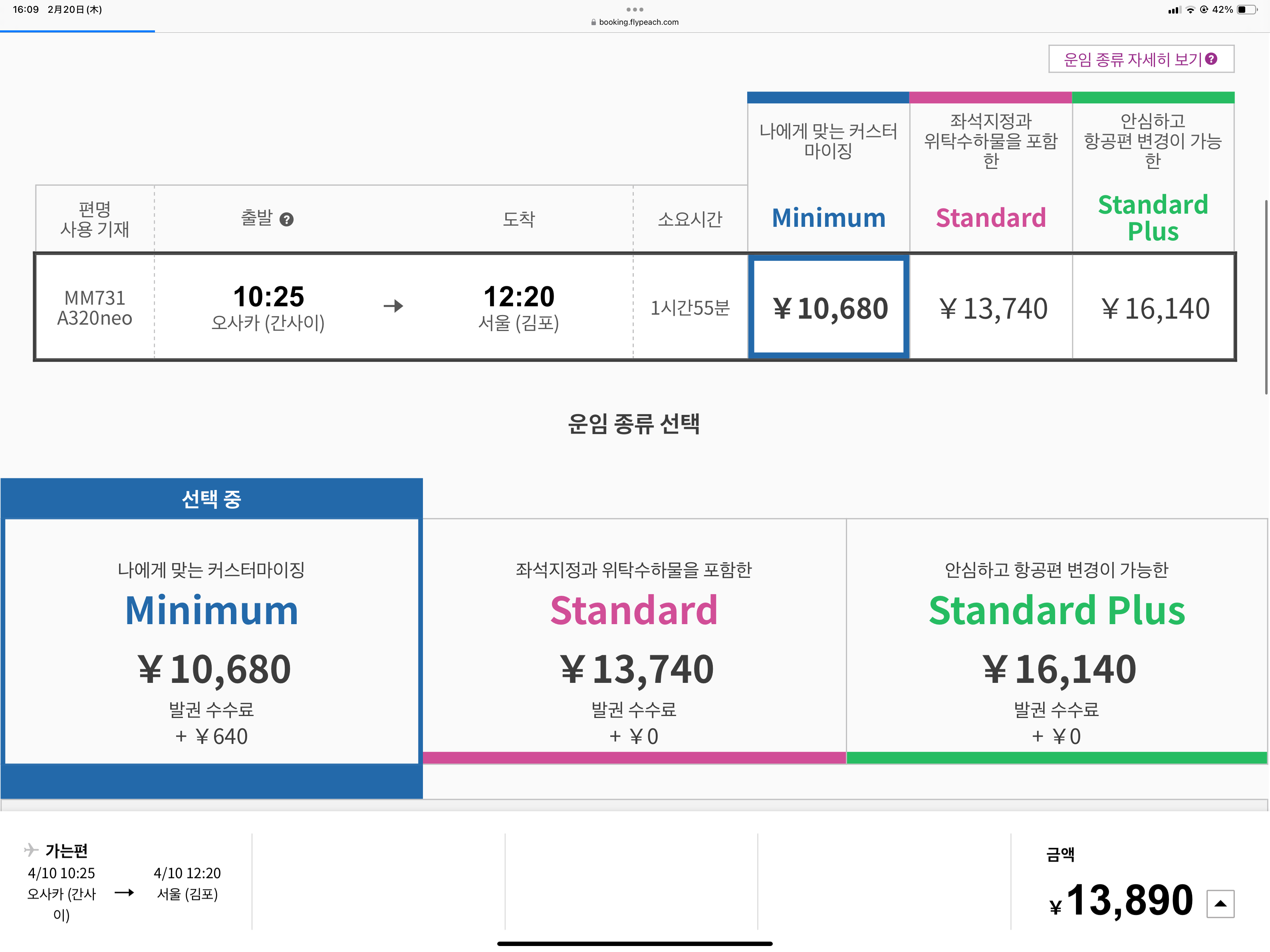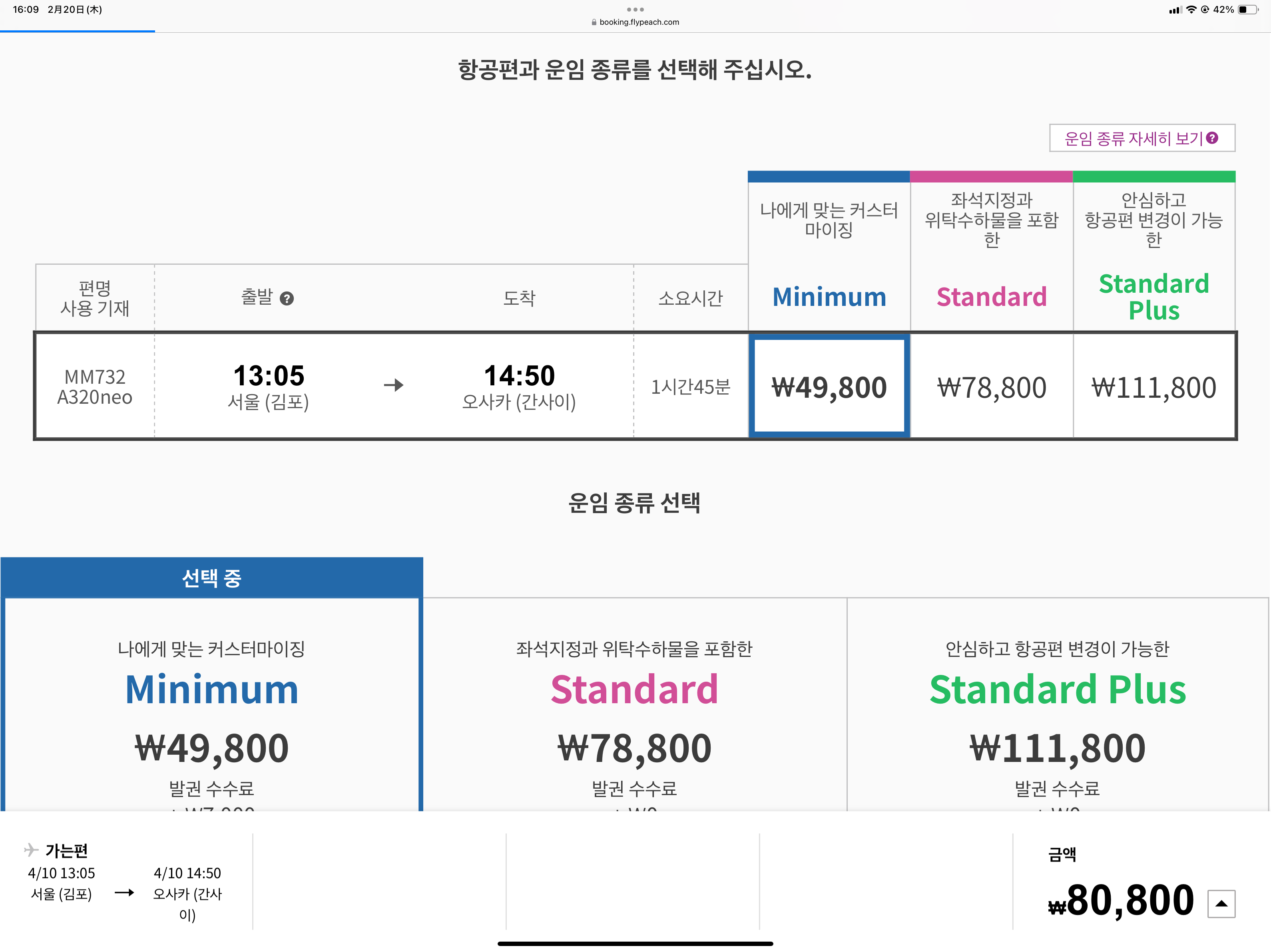 편도 요금 총액은 김포-칸사이가 KRW 80,800원부터, 칸사이-김포가 JPY 13,890엔부터 시작입니다.