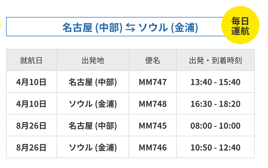 MM745 나고야/츄부(NGO) 08:00 ~ 서울/김포(GMP) 10:00