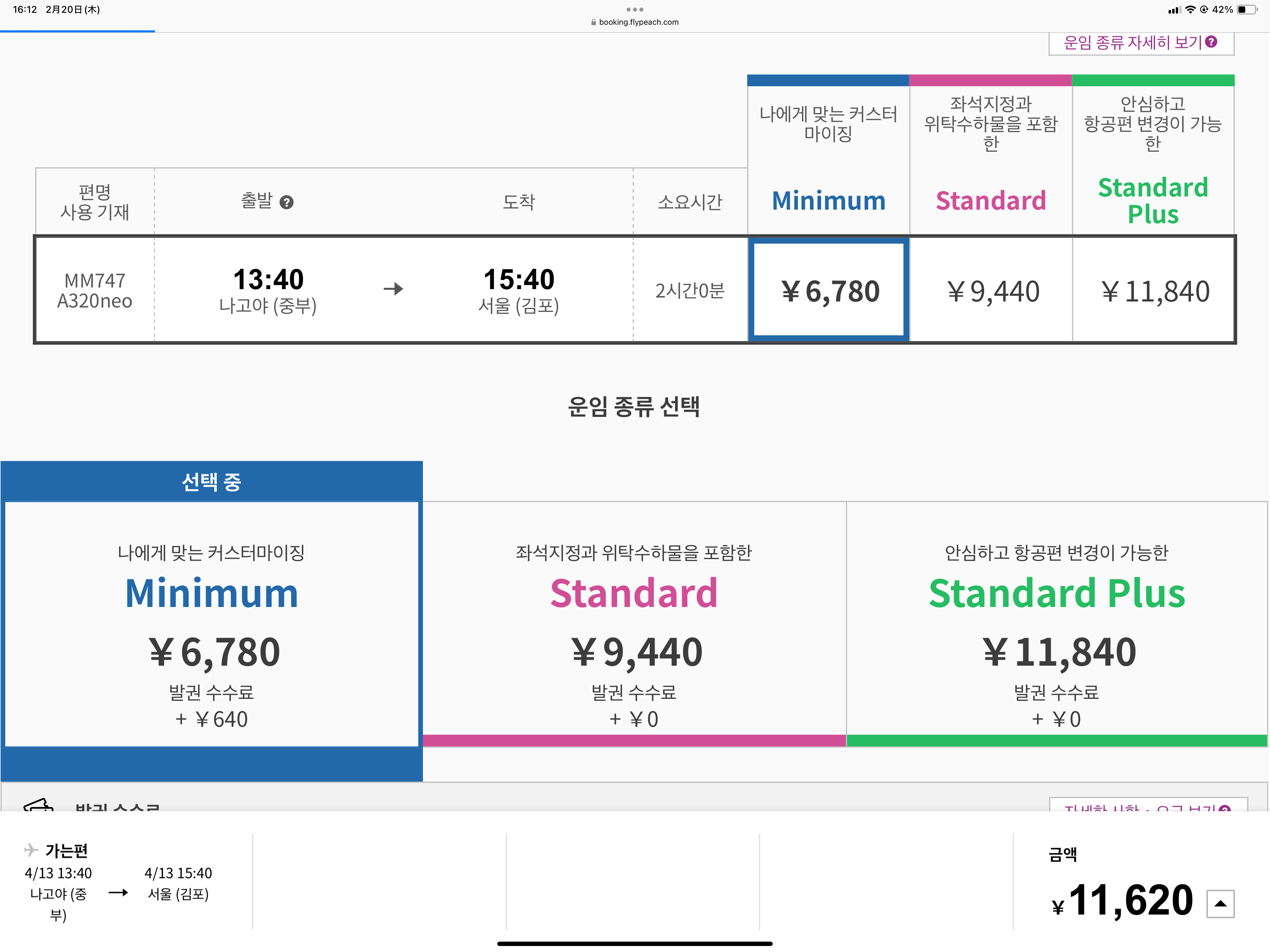 편도 요금 총액은 김포-나고야가 KRW 85,800원부터, 나고야-김포가 JPY 11,620엔부터 시작입니다.